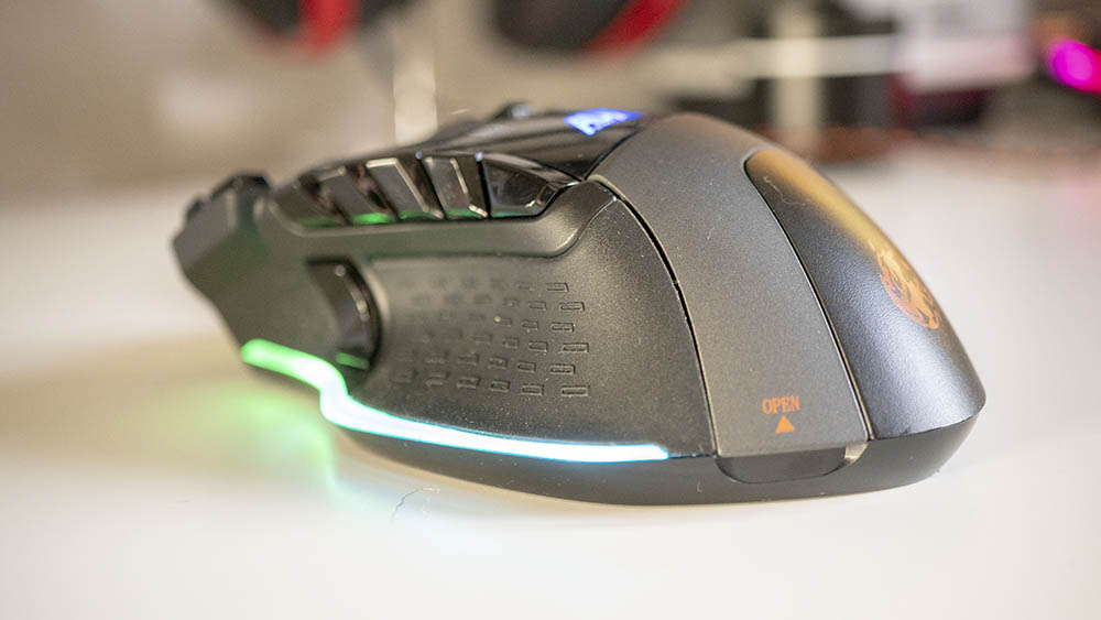 On the base are smooth seemingly plastic dome feet which makes the mouse easily flow across a mouse mat or desk or whatever surface you’re using. I personally prefer a gaming mat to use with this mouse. The mouse itself is pretty chunky too, which again I loved due to my larger hands and the fact I feel most comfortable with a palm grip. There’s enough hump at the back to rest the centre of your hand and even a lip for your thumb at the bottom. Your fourth and fifth fingers are kind of left to droop though. A lip on the left would have made this a little more comfortable.