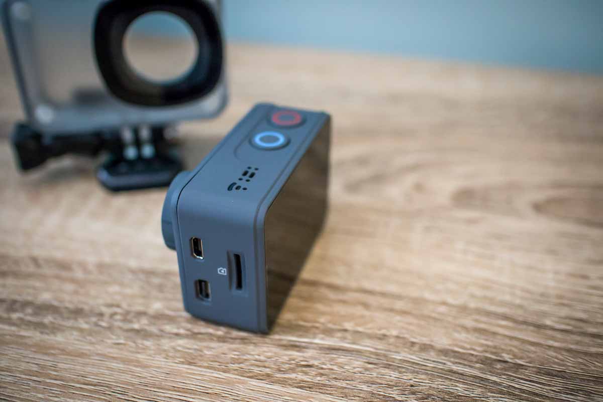 The cam itself is the typical shape, size and appearance you would expect from an action cam. A grey rubber exterior, a lens at the front and a large “2 touch screen at the rear. To the top of the cam are two buttons, used to turn it on/off, mode selection and triggering record, plus the inbuilt microphone. To one side are the ports, mini USB, micro SD card slot (up to 64gb) and micro HDMI. The other side has a small speaker and the bottom has your standard 3/4” tripod hole and a cover to access the battery.