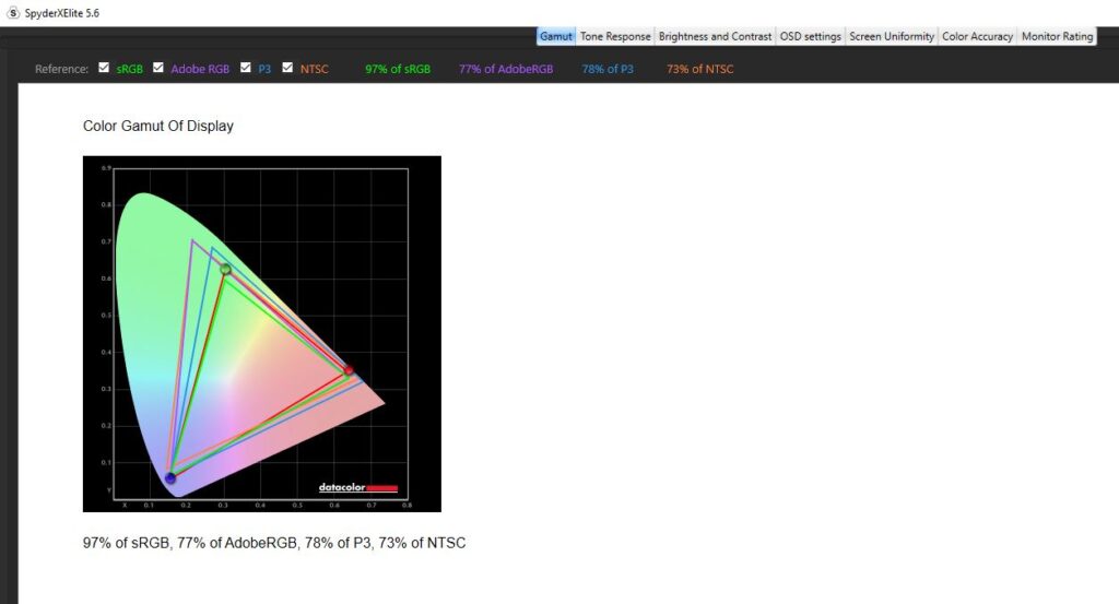Diving into a calibration test, I ran it twice. Once before any kind of colour calibration had been done, and once after I had calibrated the colour. For the most part, the testing was nigh-on identical. Dell claims the Alienware AW2523HF has a contrast ratio of 1000:1, which is pretty on par with my findings. The contrast ratio was slightly different, with a 1110:1 pre-calibration and a 990:1 post-calibration which I wouldn’t say affected anything to do with gameplay and colour accuracy scored a slightly better Delta-E of 2.73 from 2.66 after calibration. Testing its colour uniformity, there was a hot zone in the bottom left and right-hand corners, which fell in line with what I was getting from the edge-lit LED backlight from the IPS glow present in the monitor. Of course, this is the worst-case scenario, and the image was taken in a very dark room. This had no effect on my gaming or even productivity when using the monitor and was non-existent when using it in my day-to-day life. On here as well you can see that Dell has used an anti-glare coating on the screen, which is probably causing that lack of max brightness but it’s there to stop reflections from being too distracting from lights in your room. Its luminance uniformity was actually very good, I was impressed with the score here and finally, while Dell claimed the monitor covered 99% of the sRGB colour gamut, testing for this pre-calibration though saw a score of 94% and after a calibration. The AdobeRGB score came in at 78%, 78% of the P3 gamut and 73% of the NTSC colour gamut. All in all, not a bad score, but there are definitely better monitors out there for colour accuracy. There’s 400-nits of peak brightness which isn’t too bad. Not enough for HDR gaming by any stretch, though this is an option you can turn on, but more than enough to get you through a game of Valorant. It was a little disappointing in this area, unfortunately, and I am someone who does prefer a much punchier monitor when it comes to brightness, even if it means losing out on some colour accuracy.