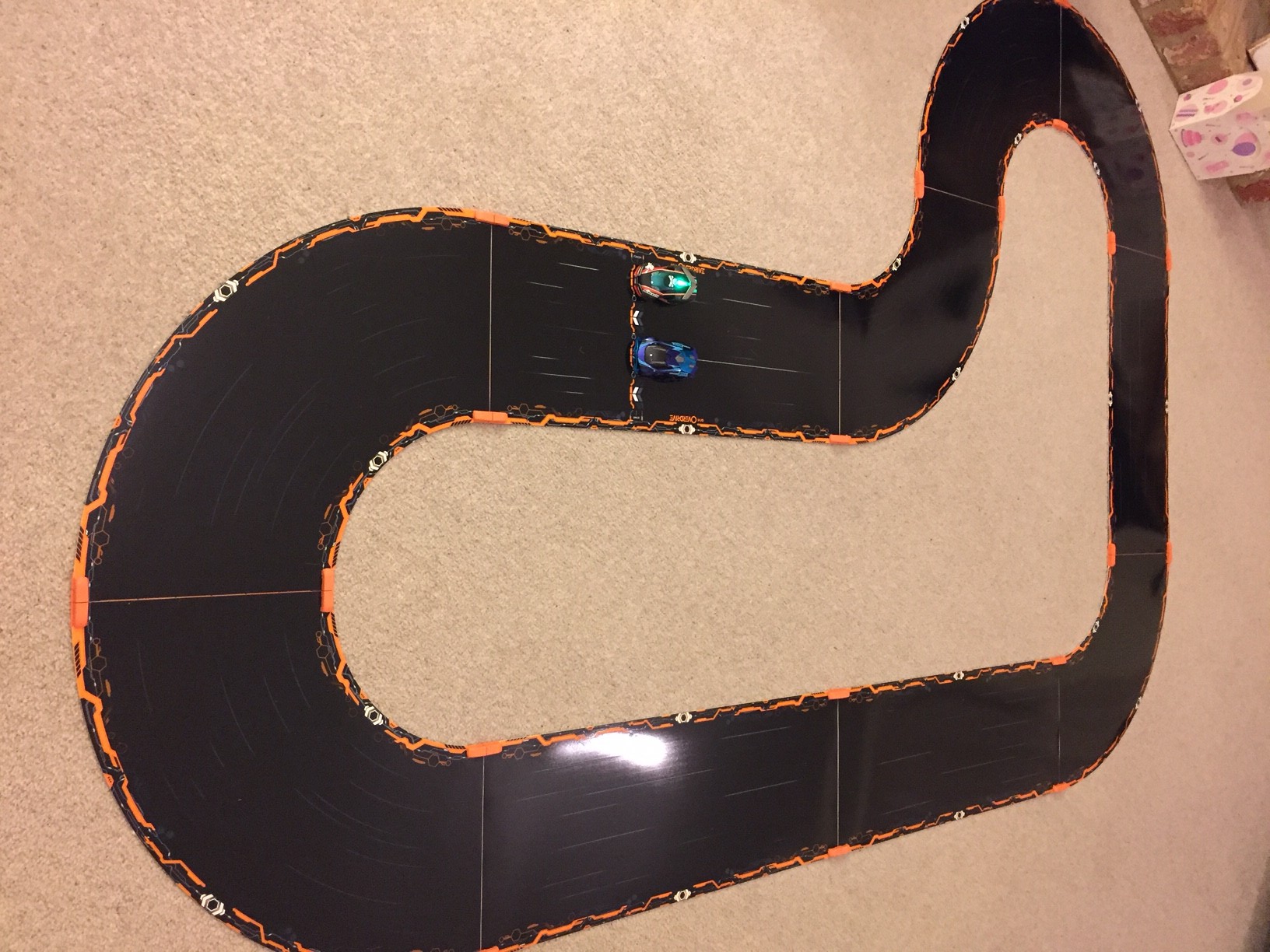 The track is a thin, flexible, bendy, shiny black plastic, with magnetic clips at each end. The track clips together effortlessly, I didn’t have to really do anything, the magnets are so powerful, the pieces snapped together perfectly and stayed in place for the duration of its use. The track is wide enough for four cars and has four lanes to choose from and switch between. Very easy to set up and very customisable.