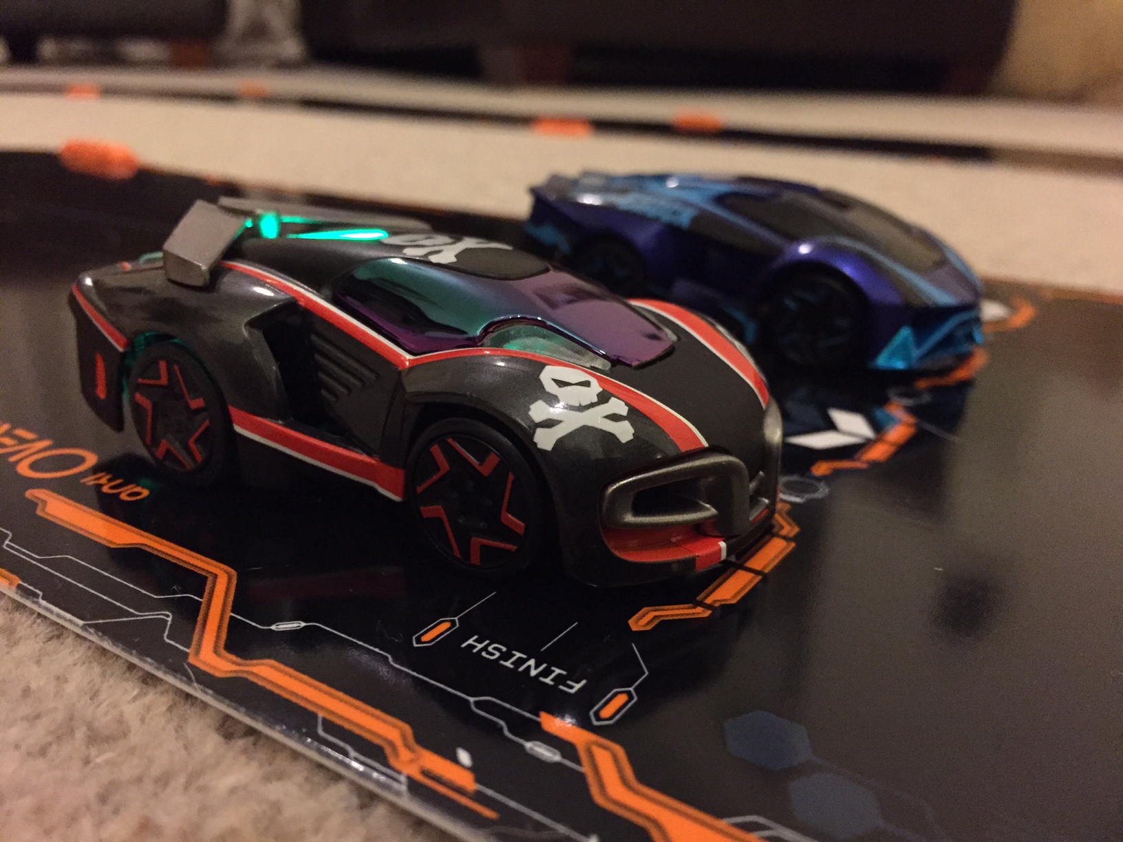 The track was set up, the cars were charged, it was time to play! First thing to do was to download the free Anki Overdrive app, which is available on both iOS and Android. It’s quite a large download, almost 800mb which is quite a lot for an app, so make sure you have plenty of space on your phone or tablet, and maybe a WiFi signal too so you don’t cut into a chunk of your data allowance. Once installed, it’s just a matter of following the instructions within the app to set up the cars. To start things off, there are a few single player races, against a commander (AI) to run you through the different game types and the controls. There are five different game modes available, Race, Battle, Time Trial, King of the Hill and Tournament. Controls are very easy to get used to, there is an up/down throttle to control speed, buttons to use your abilities and you tilt your device left and right to switch between the four lanes.