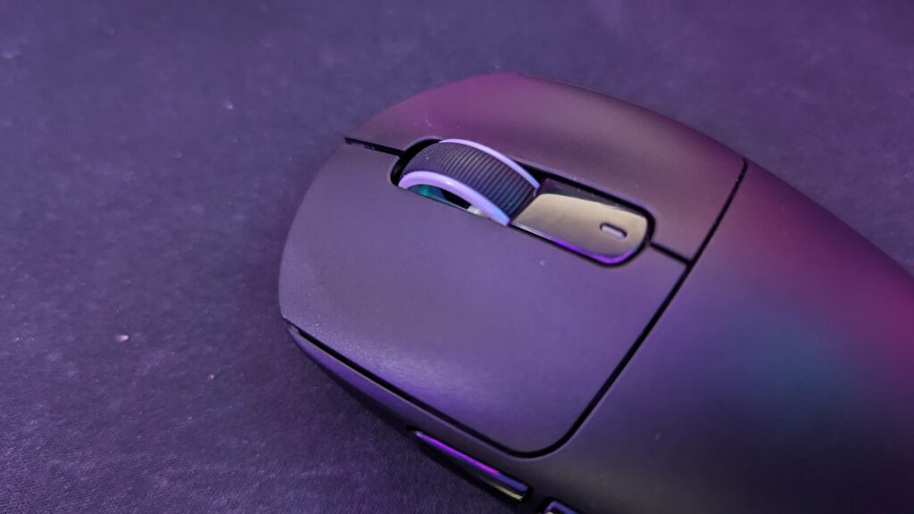 The whole thing is made from plastic though not in a cheap way. You’re not going to be crushing this thing with hand pressure. It has a smooth texture though and no rubberised sides which is a bit of a shame and it’s a bit front-heavy so the balance is a little off. There’s enough grip to whip the mouse across a pad but it is slippery. You got some satisfying clicks thanks to the Kailh Black Mamba switches for left and right clicks with no wobble, and the actuation is nice and clicky and the bounce is nice. The scroll wheel feels solid and not too stiff. It scrolls in increments making it nice and easy for actions like switch weapons inside of games. The middle mouse click is firm. The side buttons are a little too far back for my liking, but depending on hand size your experience may vary, though the clicks again here are satisfying enough.
