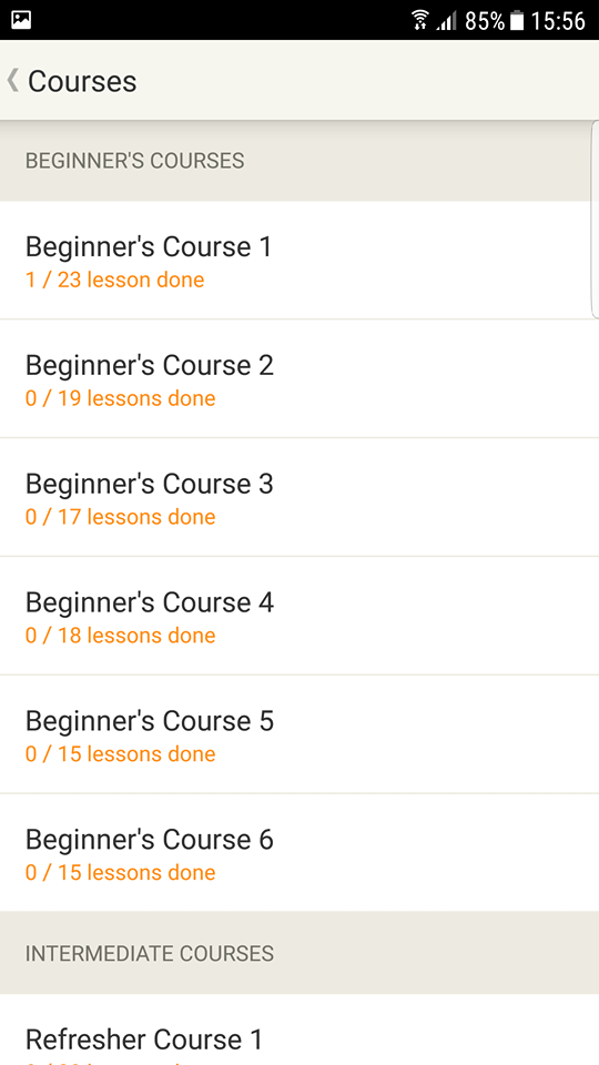 So content is laid out into various groups. These start with beginner courses all the way through to intermediate and grammar teachings. It’s a great way to introduce even the most inexperienced person to be able to start learning. The beginner courses which I’m working through now are very basic phrases to learn such as ‘hello’, ‘how are you?’, ‘I’m fine thankyou’ and ‘Are you Mr Doe?’.