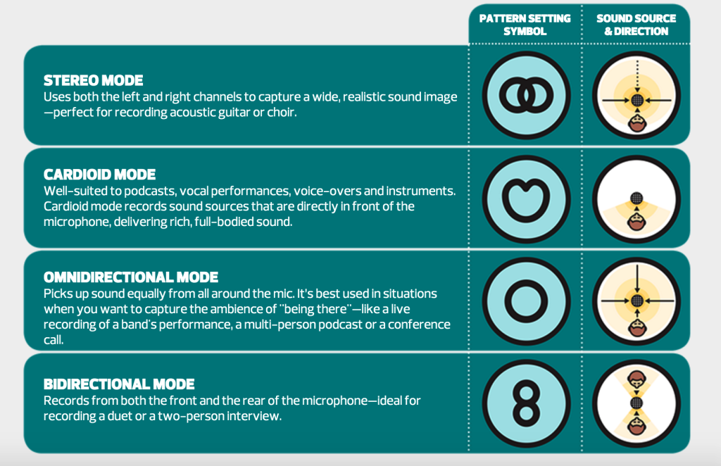But it’s not just flexible with its software compatibility. The microphone uses something called Omnidirectional technology, which in a nutshell means it can capture audio at a full 360°. But, there is a toggle switch on the back which enables different directions and turns off directions entirely. Okay, so the four settings would take while and a few paragraphs to explain, so I thought I’d use this handy image I found from the interwebs to show you all four settings.