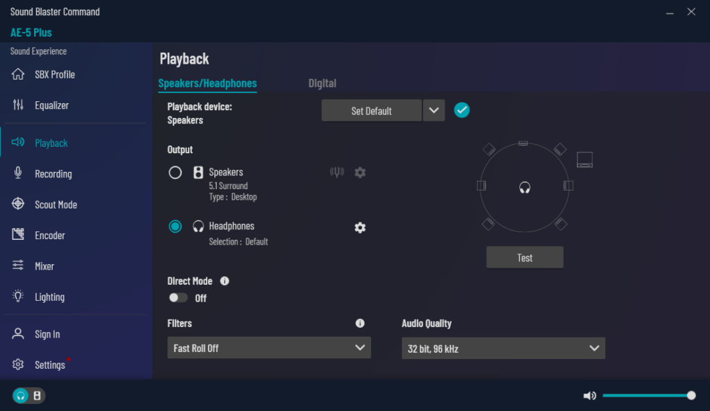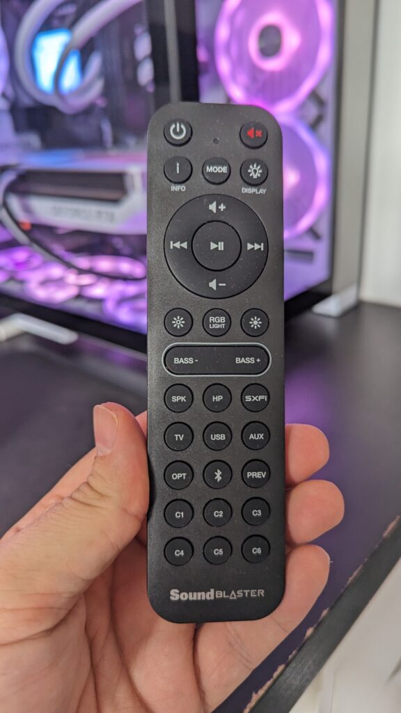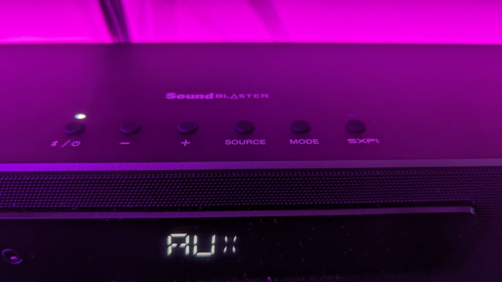 On the front, you’ve got a pretty generous screen which is bright and easily readable so you know which input you’re currently on. This is paired with a number of buttons on top for your power, volume settings, source input, and Mode which cycles through different EQ sound settings for gaming, movies, music and a flat EQ. The final button on the right activates SXFI. Unfortunately, SXFI can only be activated if the soundbar can detect and SXFI input, like from the port on the back. I’ve currently got mine set to Aux as I’m using this soundbar with a Creative AE-5 soundcard in my gaming rig, and I must say I am truly impressed with the audio quality I am able to achieve with this setup. To give you a quick idea of my soundcard settings, I’m not using a profile, I’ve got it set to a Vocal profile to boost voices in audio and media, and on my playback settings, I’ve set it to headphones, as there’s only one aux input here, though my audio quality is set at 32-bit, 96 kHz.