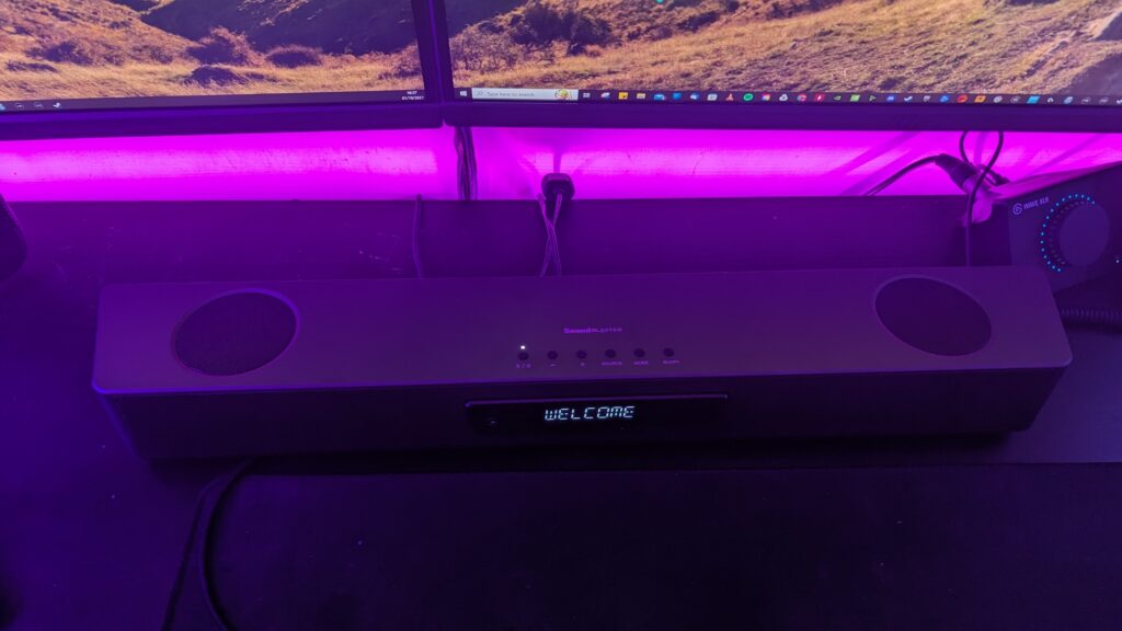 So the Creative Katana Stage measures at 650 x 109 x 78mm, slightly larger than the V2X so keep that in mind when it comes to real estate on your desk. It’s covered in a gunmetal-type grey plastic coating with an almost black front grill which wraps around the sides. On top, you can find two up-firing mid-range drivers which pair with two tweeters inside on both left and right, and around the back are two sub-drivers which can pack a punch when needed. There’s an RGB strip which comes with a few customisations, including an audio reaction mode, and this can be customised inside of the Creative App for your desktop, or it can be turned off completely if RGB isn’t for you. Overall you’ve 90 watts of RMS from the soundbar, and I must say this thing can get pretty loud.