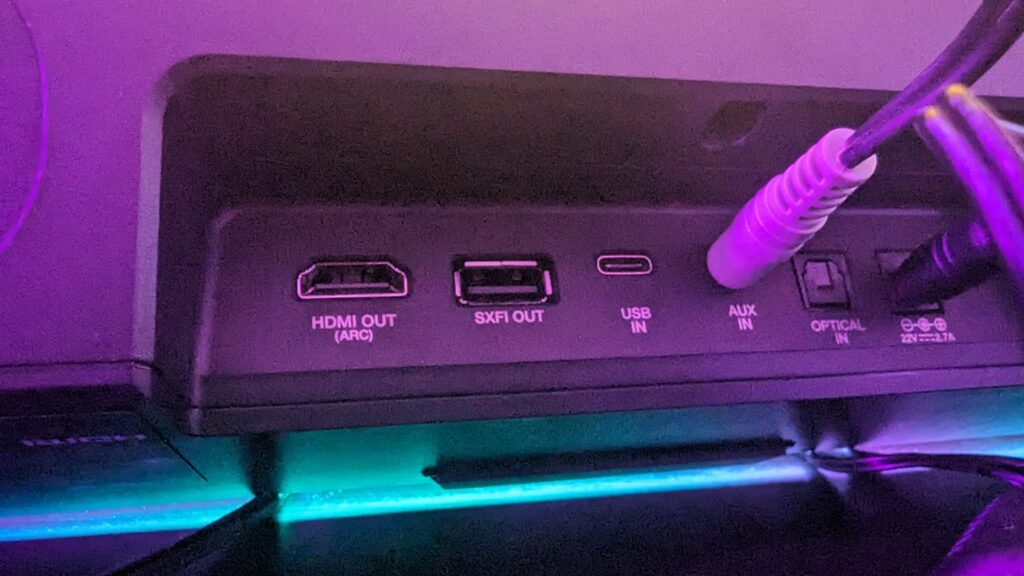There’s a whole host of connectivity options available to you too which include Bluetooth for your wireless connections, an HDMI ARC input, a 3.5mm aux input as well as USB Type-C to connect to your desktop or laptop, a Toslink input for your optical cable, and finally an SXFI-out for Creative’s SXFI Theatre headset. The only cables included in the box are for power, your optical cable and a USB Type-C to Type-A cable for plugging it into your PC or laptop. There’s no HDMI or 3.5mm aux cable which is a shame. Finally, there’s a headphone port on the front left-hand side of the screen for easy access.