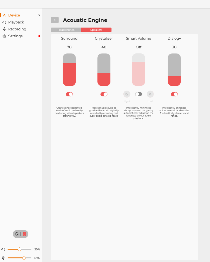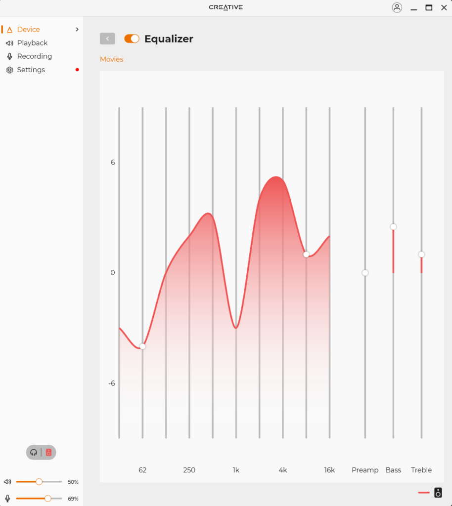 Looking through the Creative App, the software offers several decent customisations that you can make to the overall performance and sound quality of the Katana SE. The first I want to point out is the Acoustic Engine, which allows you to put a few audio effects onto your audio, being a virtual surround sound option, a crystallizer which enhances background audio and a dialog+ setting to enhance voices in various media. Scout Mode is intended for multiplayer game use, to aid in footsteps and bullet direction in first-person shooters. It’s alright, but not as accurate as wearing a set of headphones. And finally, you’ve got an equalizer for presets or custom EQ settings to fine-tune your audio, and also a mixer which can be used to pan audio, or set the microphone and audio levels independently. The Katana Stage does have a built-in microphone that’ll get you through a Zoom call with work, but it’s nowhere near the quality expected from livestreaming or creating content. Get yourself a separate microphone for that.
