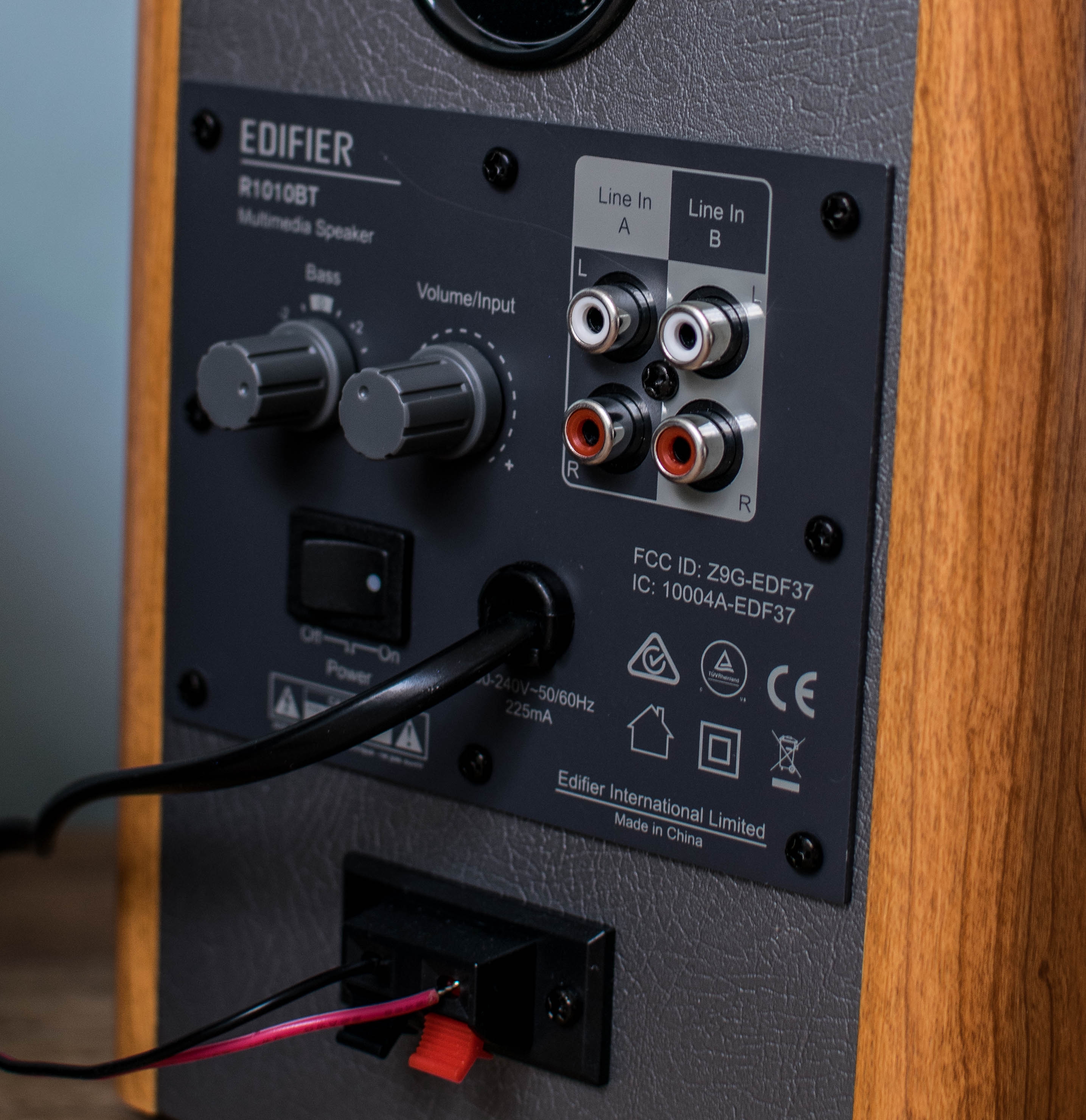 These are active or amplified speakers, so no need for an additional amplifier to power these. One of the speakers is the master, the other the slave and the master has all the controls on it. Inputs include two RCA line in’s and there two knobs, for volume control and base level. To connect the speakers together, use the supplied speaker cable.
