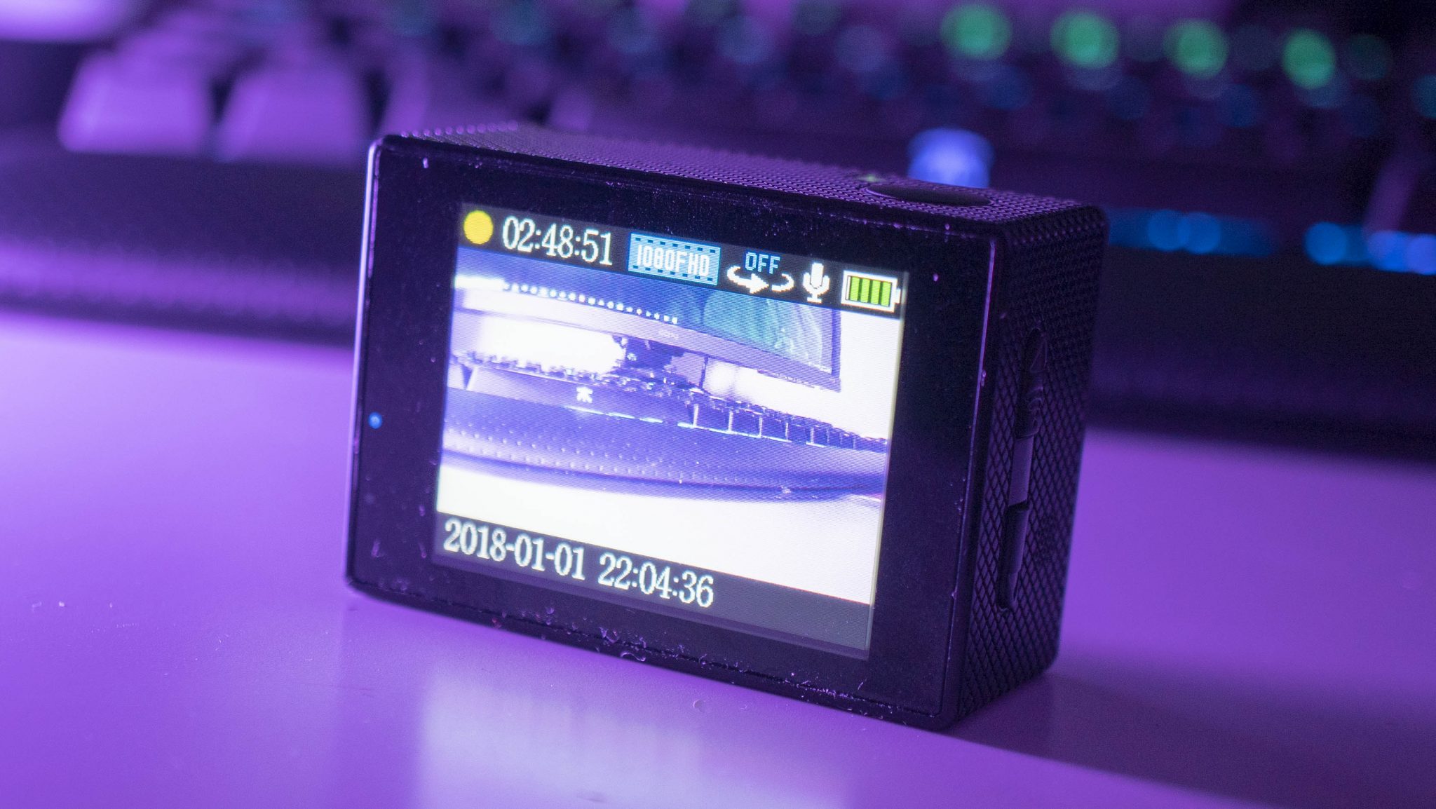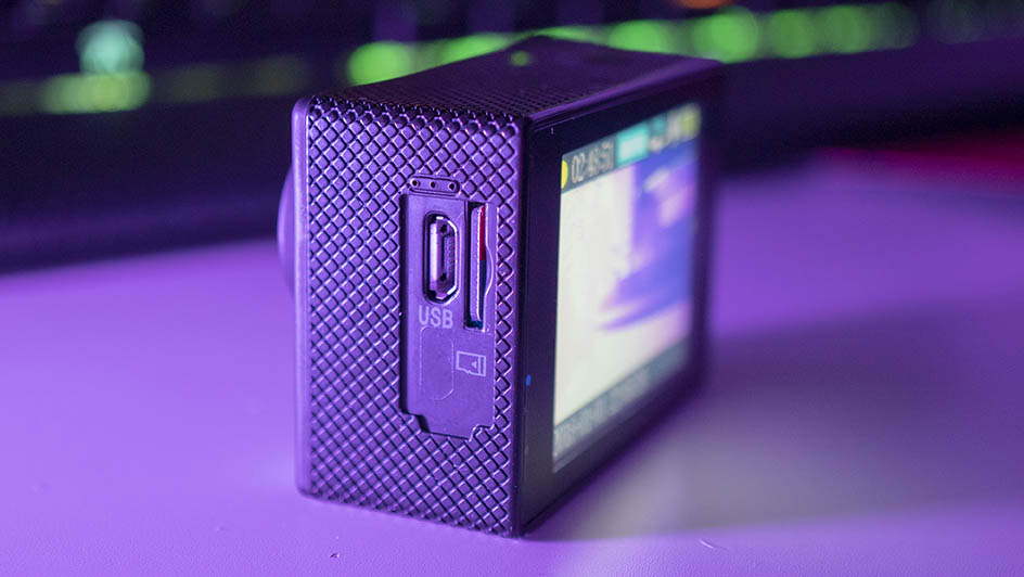 The power button can be found on the front, and a menu select button/record button on top. There are two buttons on the left hand side when looking at the camera when looking it at which are used to navigate menus and on the right you can find a microUSB charging port and a micro SD card slot which supports cards up to 128GB. The battery door on the bottom is ever so flimsy. Be careful with it. My nails weren’t strong enough to open it so I had to use a small stanley knife to get into the battery compartment.