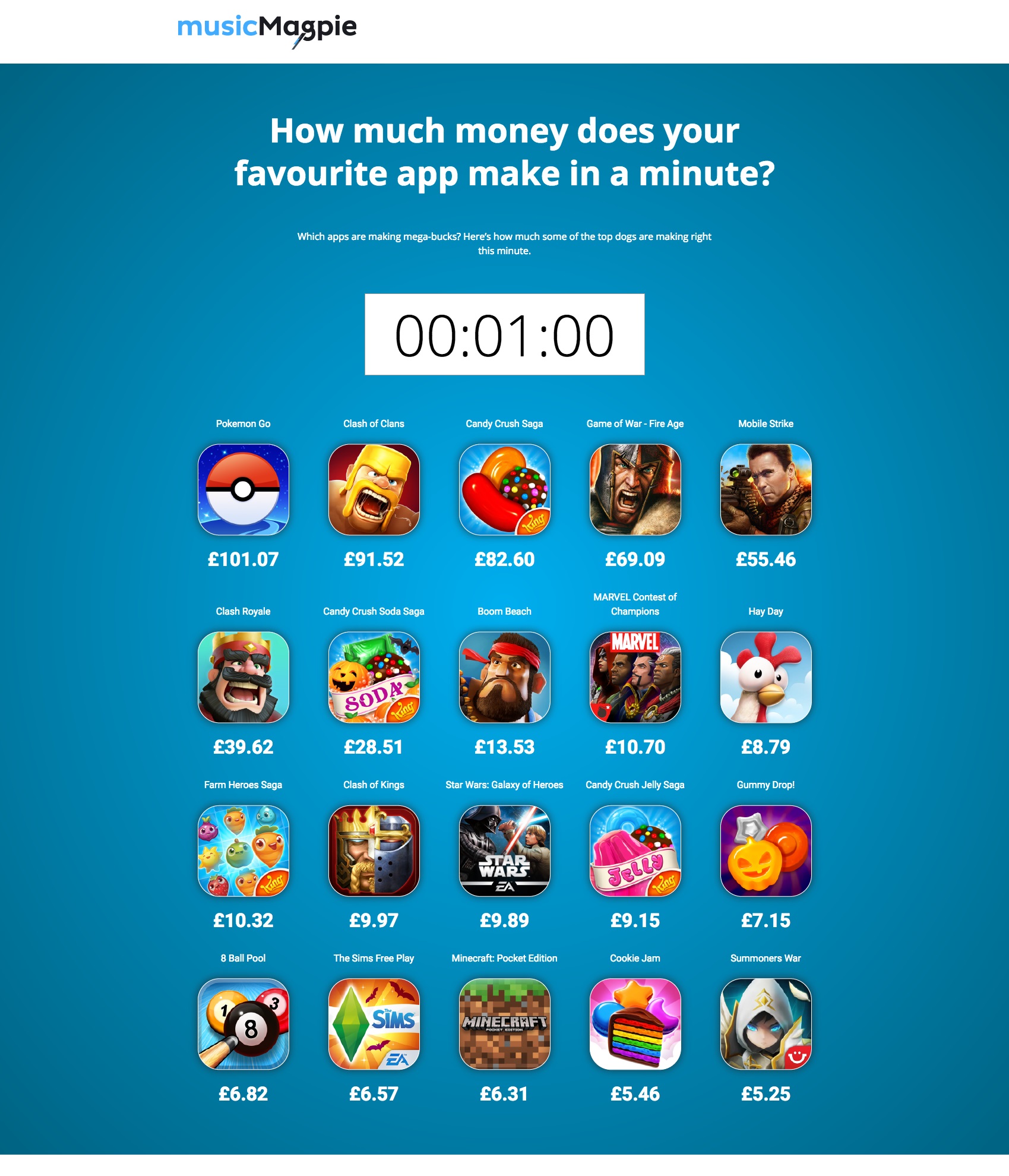 It’s very common now that an app isn’t actually free, even if you can download it for free. You will notice adverts popping up such as ‘buy 100 gems for £3.99’ or ‘buy 20,000,000 gold in Game Of War for £79.99’ (gulp), but this just seems to be the way companies are making money from their apps. We as people are lazy, we want the best items in the game, without grinding for them and are apparently willing to hand over a lot of money for this luxury. Pokemon GO does this, Clash of Clans does this and so do many, many other apps. MusicMagpie has done some research into this and found some mind blowing revenue stats. They looked at Pokemon GO, Clash of Clans, Clash Royale, Game of War, Candy Crush Saga, among many other popular chart topping titles.