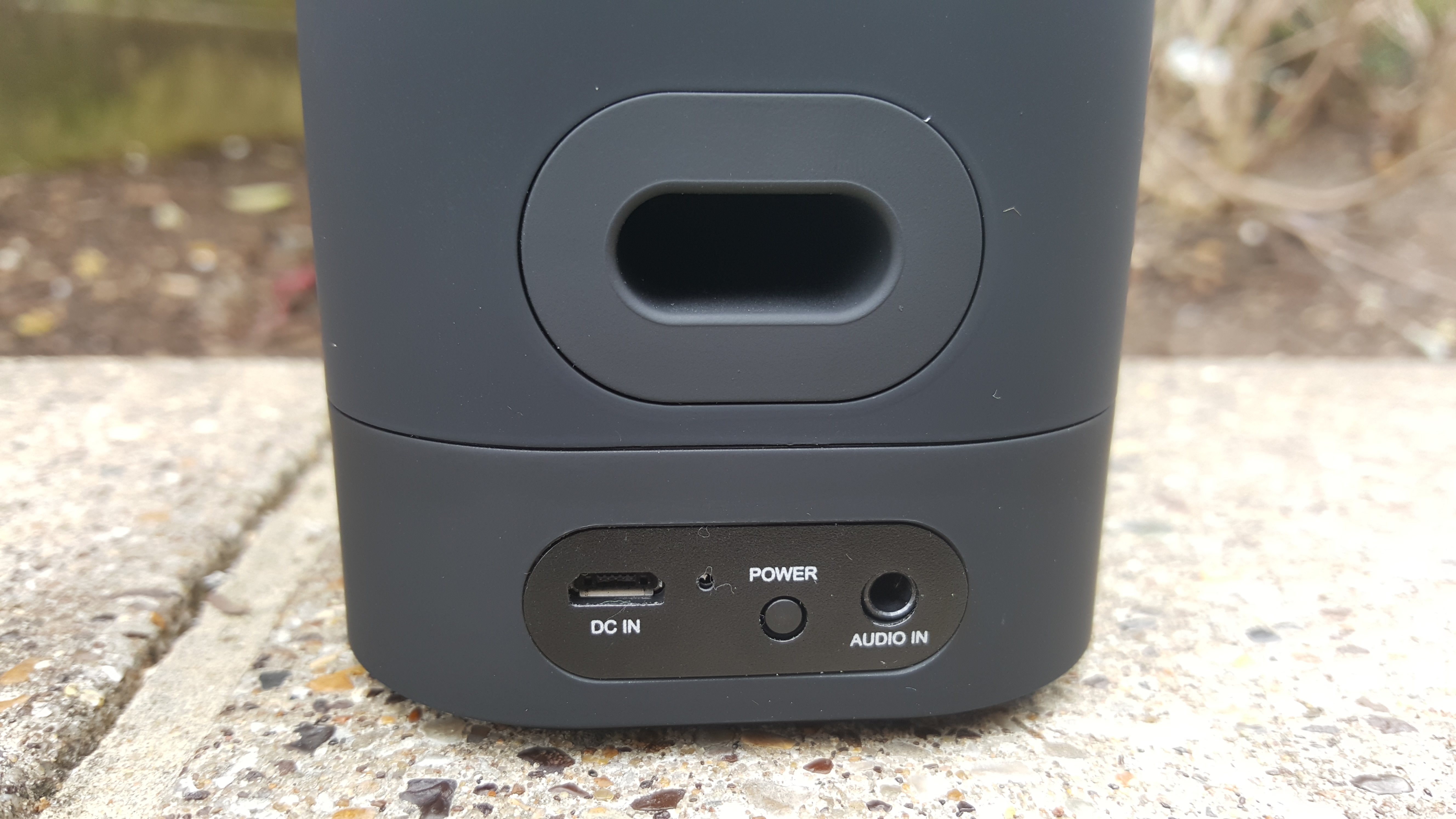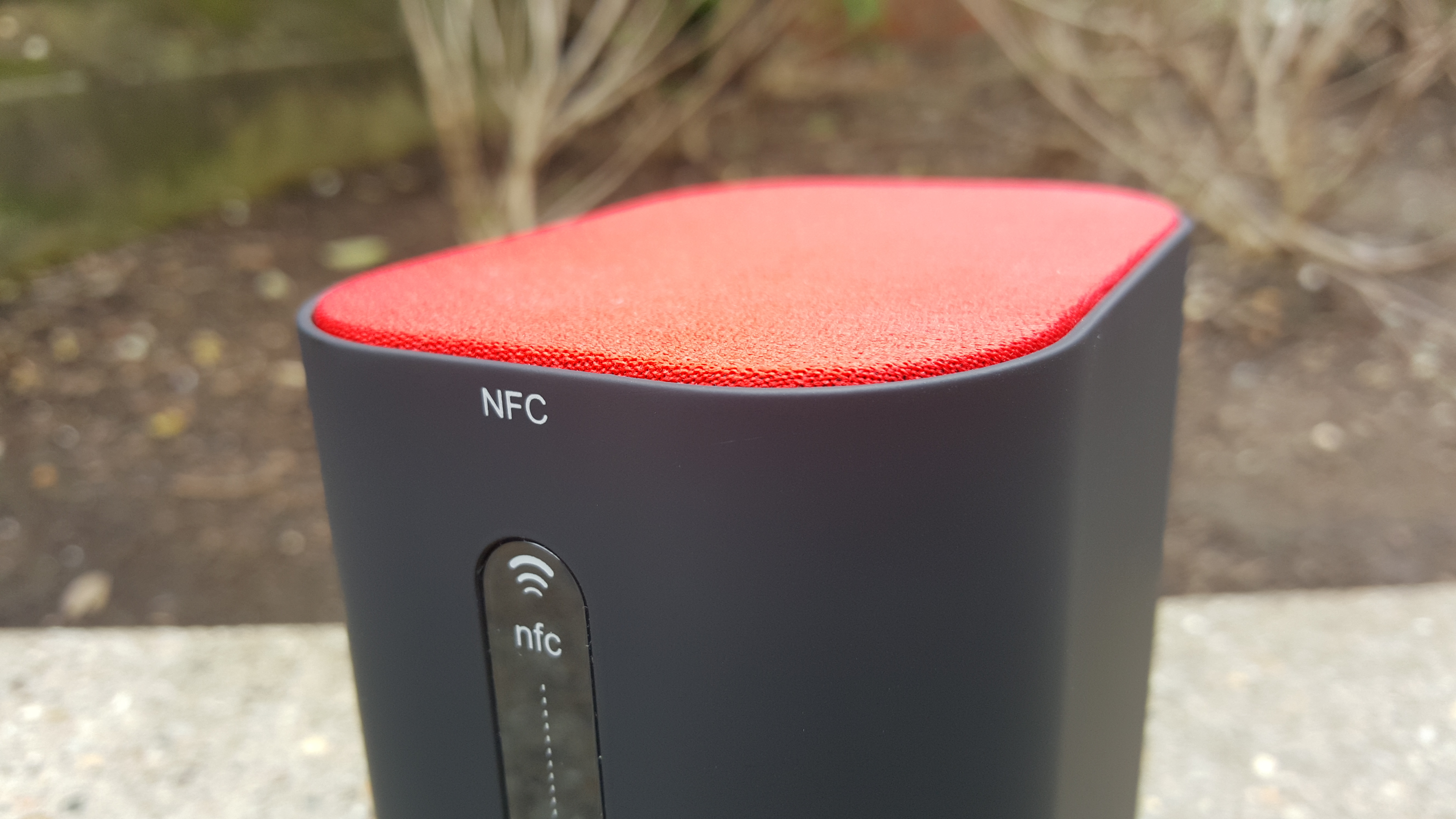 There are no buttons except a big Bluetooth enable and a power button at the back. To pair your device just hold down the Bluetooth button until it starts flashing. It can then be detected and paired. No passcode required for the speaker. There is also the option to use NFC on newer mobiles. The connection pad is on top of the speaker. Just hold your NFC device to the pad and you’re paired. It worked well for us, nearly instantaneous connection. The speaker will be remembered on Bluetooth devices for easier pairing in the future.