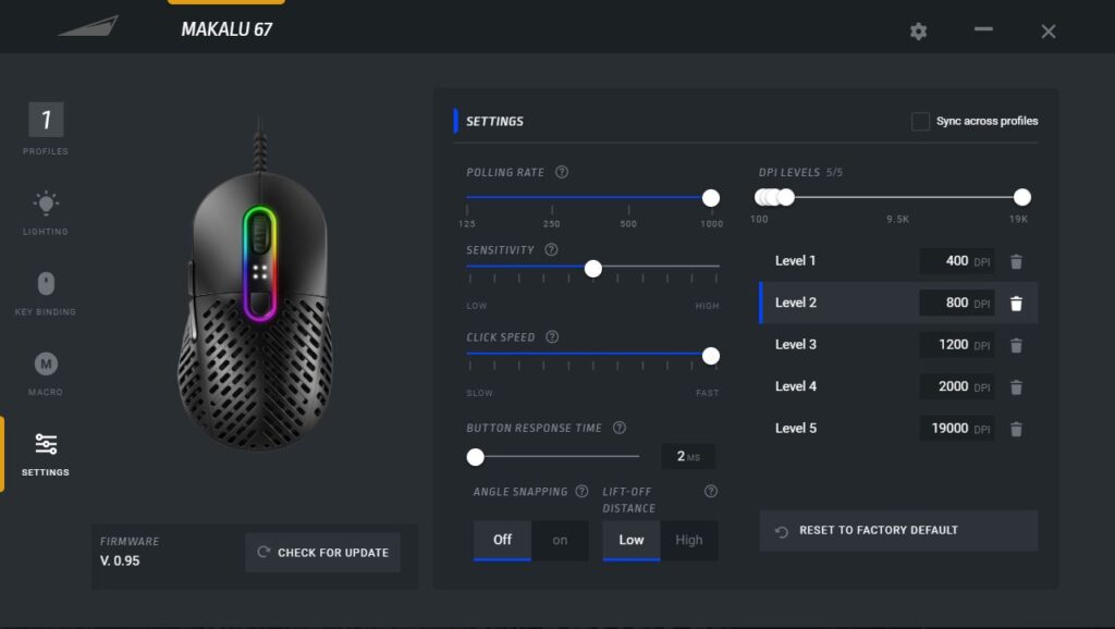 There’s no doubt that the Basecamp driver is one of the simplest to operate on the gaming mouse market. The fact that the software is so nicely aid out, and very easy to punch between each menu is a breath of fresh air. And gamers can expect everything that they want from an adjustable gaming mouse, like the ability to record macros, or change the RGB effects. One key element of the Basecamp software is the abilty to change the mouse’s workings. Things like pinpoint accuracy on your DPI switch, or your polling rate, cursor sensitivity, which is especially useful for working on your desktop, or even inside of MOBA titles, and one thing I have never seen before in a mouse’s software, and that’s click speed, which changes the time it takes to send a double click command to the PC.