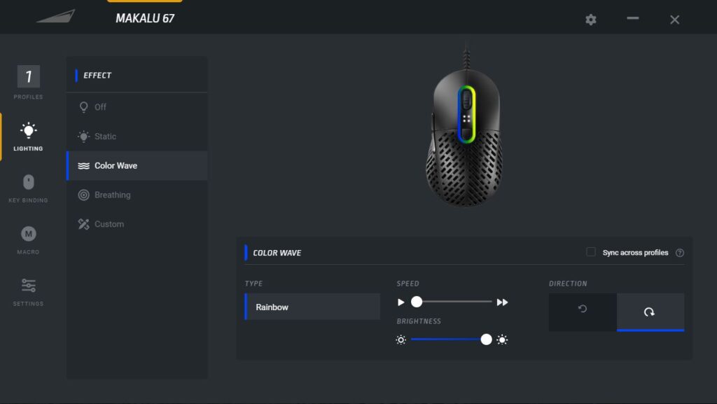 There’s a subtle RGB effect that cycles round the outside of the scroll wheel and adjustable DPI button. I suppose it’s Mountain’s way of appealing to that gaming audience. It’s relatively odd though, that inside the app, the lighting effect clearly shows it flowing from colour to colour smoothly, but in reality, it’s a littly stuttery, like each LED inside of the mouse is turning to one colour to the next rather than creating a flow or fade effect.