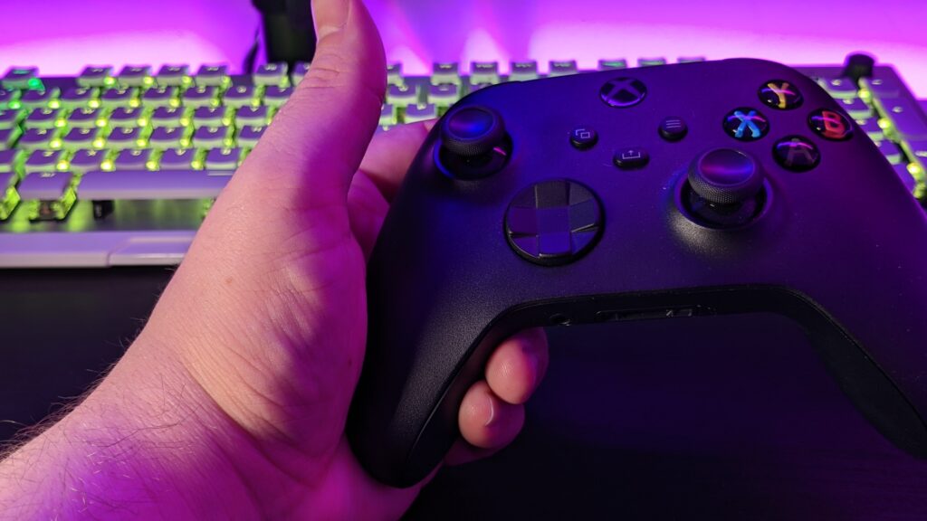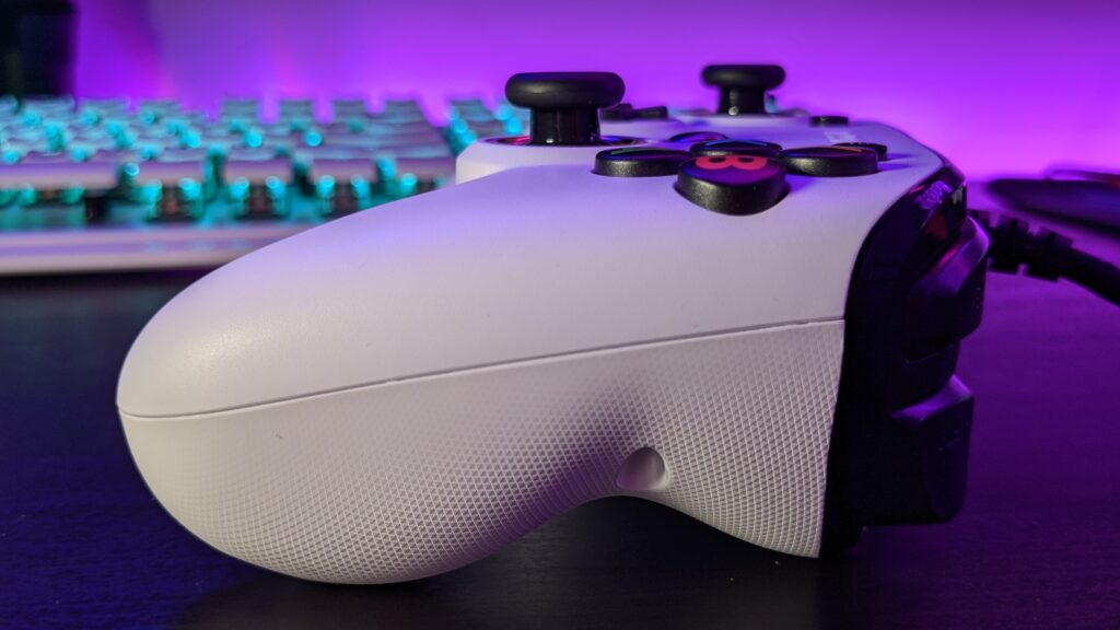 The main noticeable difference with the Nacon Pro Compact, when compared to a traditional Xbox controller, is in the handles, and also around the bottom, just under the Dpad. These areas have been significantly shrunk down and for me personally with my hands, feels now a little harder to hold on to. Nacon claims it’s been shrunk up to 15% over traditional controllers. I liked the fact the handles of the original Xbox controller were held in place by my thumbs. But with the Nacon Pro Compact, I had to use my last three fingers to hold it. Weight-wise, the Nacon Pro Compact feels pretty light, which kind of offsets the awkward holding though the back of the controller has a rough texture for your fingers to grip to.