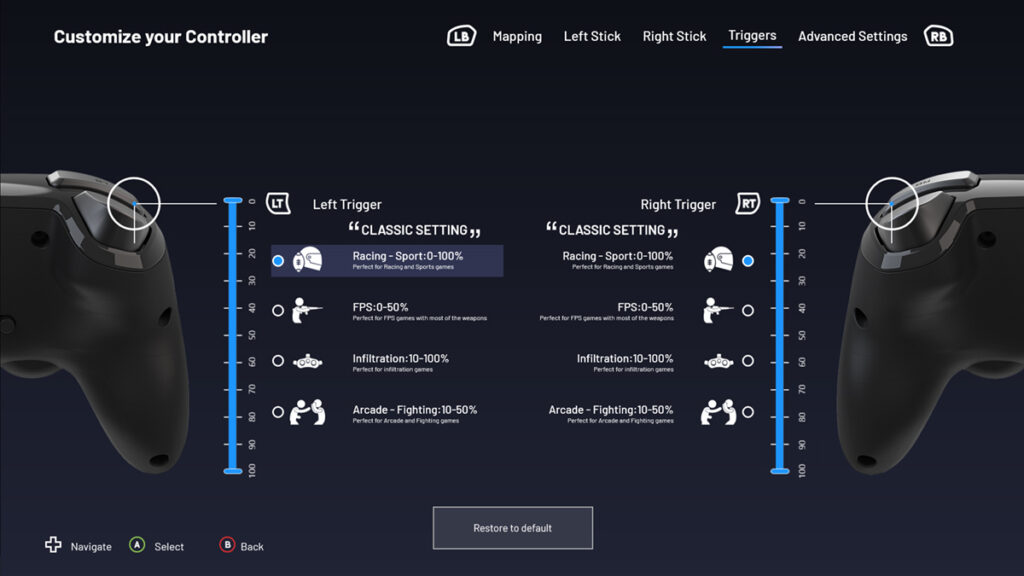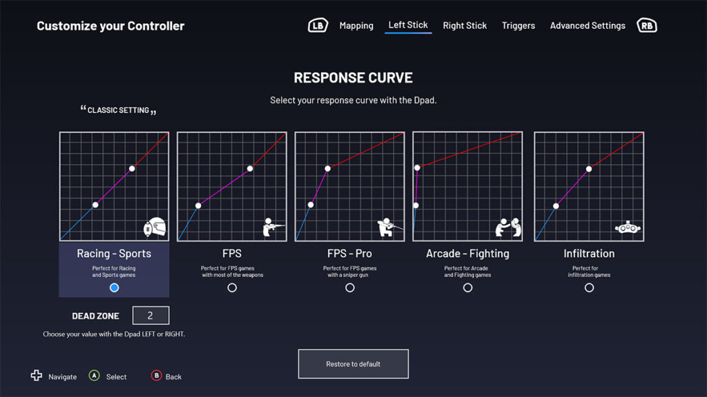 Button responsiveness is very good, and I never found myself mispressing or buttons not registering, and all of the buttons have a nice firm and tactile click to them, including the shoulder buttons. There’s less travel distance in the triggers compared to the traditional Xbox controller which for FPS games is really good, but for racing titles where millimetre movements count, it’s not as accurate. Thumbsticks again are very nice. Now this is where the Nacon Pro Compact gets interesting. It has an app, which can configure and customise the controller is a number of ways. First, you can rebind buttons directly inside of the app, but what’s even better is you can change the activation zones of the triggers and responsive curve of the analogue sticks to make it easier to use in certain types of games, something that I’ve not seen done before on a games controller. However, this is a PC software, so it doesn’t work with Xbox consoles.