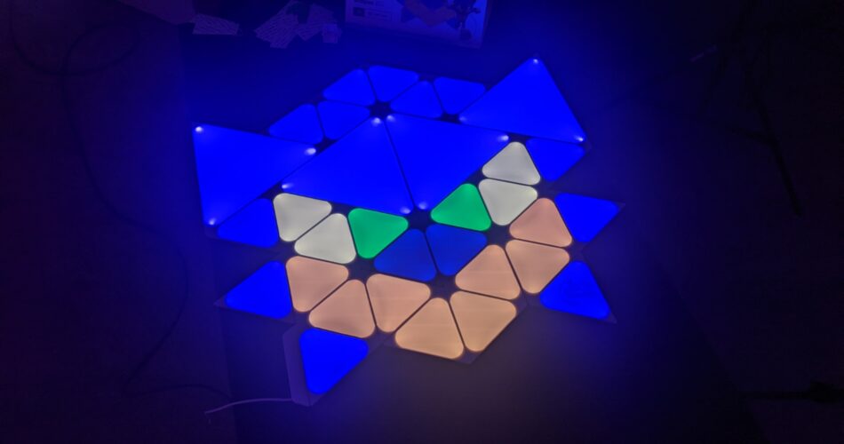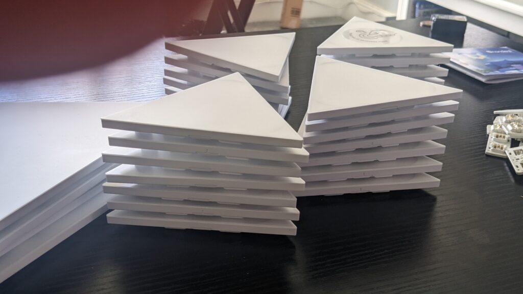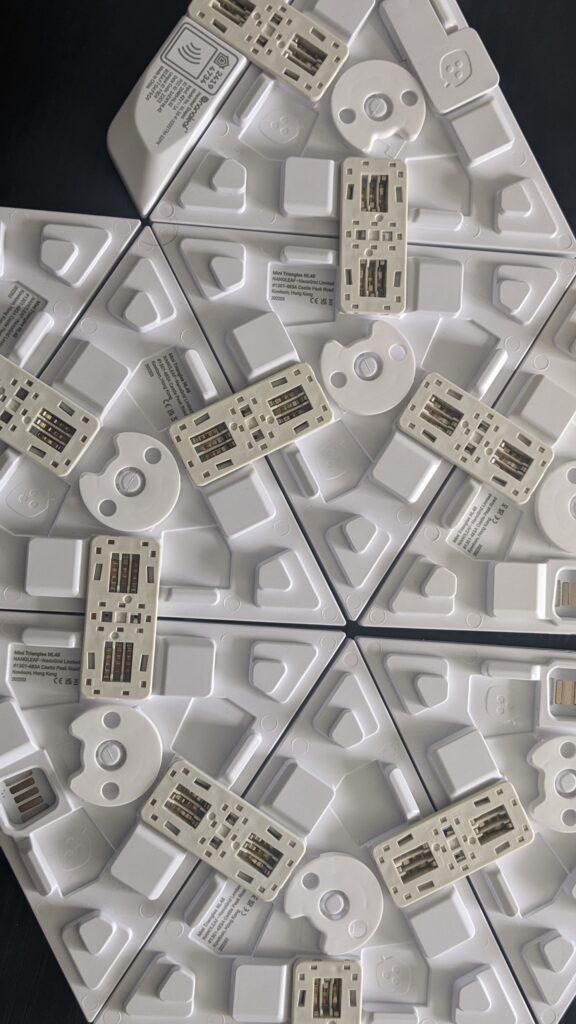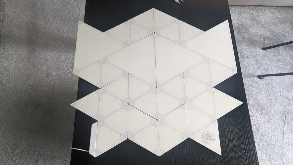 Setting up the panels was a bit of a puzzle at first but I used the box to find my way through the exact setup needed. I followed the image on the box by the way and laid it out on the floor before I started messing around with the plastic panel connectors. There weren’t any instructions in the box, so I had to guess which panels needed the connectors, which at this point I thought was fine, but more on that in a moment when I talk about lighting scenes. Everything powered up, and did the flashes normally with Nanoleafr products to say it’s ready so I proceeded into the app.