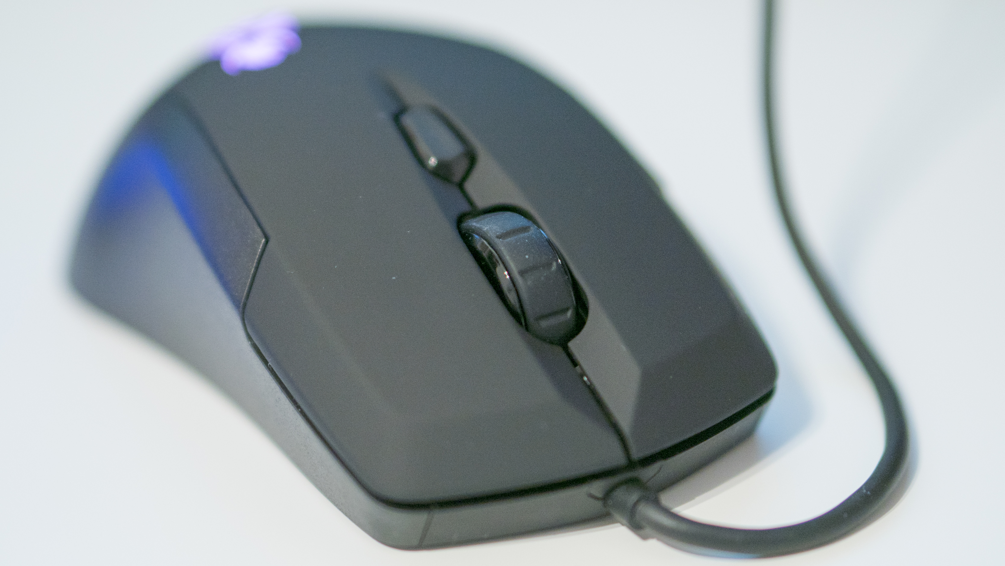 The entire mouse is made from plastic, shaded differently from black to grey. It’s not the kind of mouse that’s going to turn heads when you take it to a LAN party to use and probably won’t impress your friends as it doesn’t have a million lights glowing from it. It does however have a dim glow where the Roccat Kiro sign is under the palm rest which looks quite classy. This is RGB so you can at least customise it to match your setup. I’m using the Roccat Skeltr as my main keyboard driver at the moment and have both devices set to a blue colour.