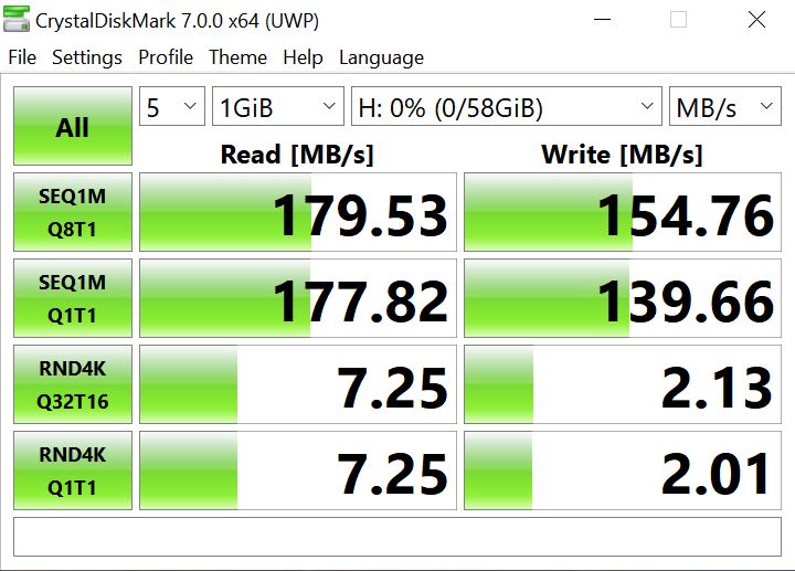I have an Asus Prime Z370-A II motherboard, and on the back of that I have two USB 3.1 Gen 1 ports next to my Ethernet, so I used those to measure transfer speeds. Oh, and I formatted the stick to the default exFat format too. SanDisk are claiming up to 200MB/s read speed and 150MB/s write speed. In actual fact, using CrystalDisk I was getting a maximum of 179.53MB/s read and 154MB/s write speed.