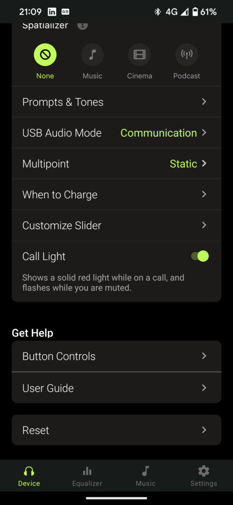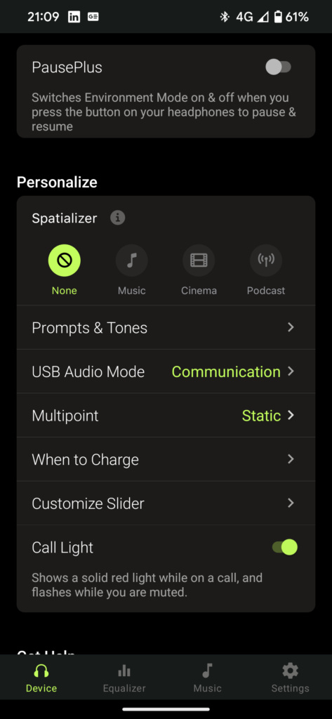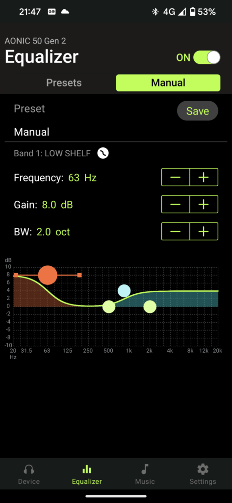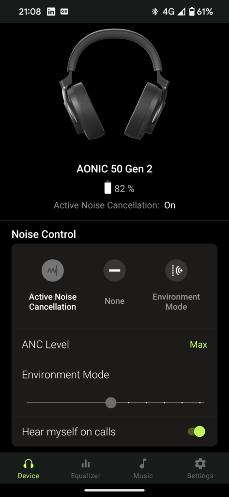 There’s an app that you can download to Android and iOS devices called ShurePlus Play which unlocks a few custom settings you can change to get the most out of the headphones and it’s easy to set up. Just connect your phone to the headphones using Bluetooth and the app will auto-detect the Gen 2s. From here you’ve got three tabs at the bottom of the screen where you can find your settings. The first tab is for the physical settings of the headphones where you can find settings for things like how amplified the passthrough audio is on the Environmental mode or how dulled your environment is on ANC. Under this, you have your Personalisation settings. These settings can be attributed to things like how your headphones act when plugged in to charge,e if you’ll allow 32bit-384kHz playback when using them with a laptop or desktop when plugged in via USB, or what the slide toggle does on the side of the right earcup, if it changes between environmental or ancient modes or if it activated different equalisers and more.