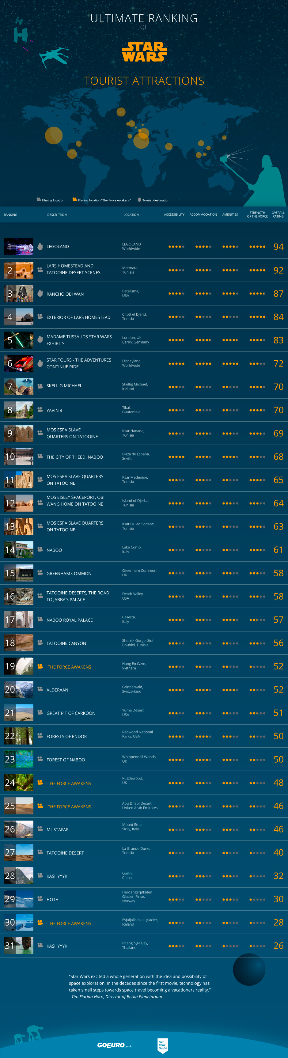 The locations have been ranked in order. To work out these rankings, GoEuro and GetYourGuide have included several factors including accessibility, accommodation and amenities (each worth 10%) with the Strength of the Force (worth 70%) to work out the overall score.