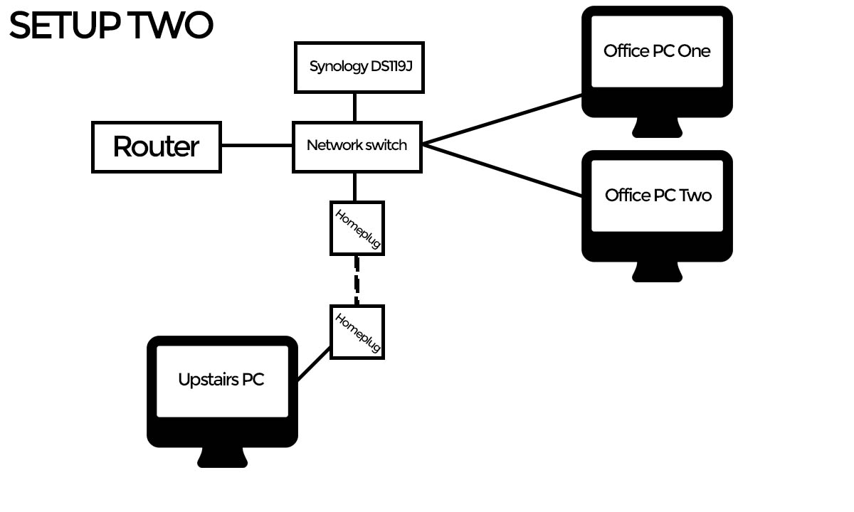 Setup was fairly simple. In fact, I was surprised at how easy it all was to get going. The unit requires power which is included and there is a Cat-5E cable included in the box too to plug it into your network. I ran a couple of tests on the drive from two different places in the house. At first I plugged the NAS into my homeplug, the same place my desktop is plugged into, and the second was plugging it into a gigabit port on my network switch so it could be shared by the majority of the PCs in my office. Results to follow, but below is a small diagram of how my network setups looked.