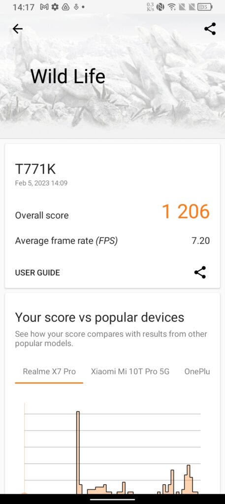 Following on from this we ran a 3DMark test, just to see what kind of gaming performance you could get from the device and it gave us a score of 1,206 with an average frame rate of 7.2 on its recommended Wildlife test, which in all honesty isn’t really that bad considering the benchmark test pushes the phone’s resolution to a 1440p resolution. The phone will be able to play some Candy Crush or Clash of Clans, but if you’re going to be needing a phone for PUBG or Call of Duty Mobile, then you’re going to have to be looking elsewhere for a more powerful handset. And for comparison, similar phones with similar scores are the Huawei Honor X9 5G and Motorola Moto G71 5G.