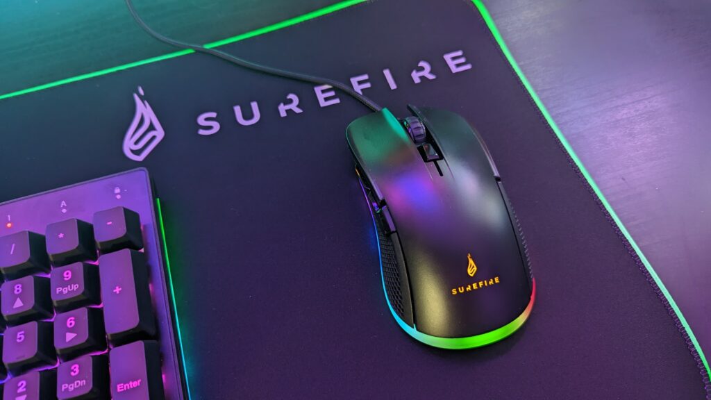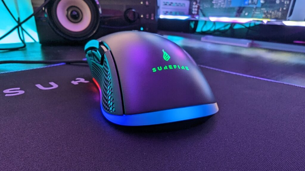 As it says on the tin, this is a gaming mouse pad. Pretty much made from the same material as any other gaming mouse pad on the market. It’s smooth and soft and made from polyester fibre and natural rubber and aids the mouse in gliding across the surface. It’s heavily branded with a Surefire logo in the corner as well so whoever looks at it definitely can see where it’s from. It worked well with the Buzzard Claw mouse and I must say the RGB effect that glows around the outside of the mouse pad actually looks alright. It does require USB power, and the cable included is an alright length of 1.8 meters. There are multiple lighting modes which include eight static lights and 6 dynamic lights which include a full RGB colour cycle and a few others that shuffle through several colours. No driver is needed either which is cool, seeing as I’ve had a bad experience with their drivers so far.